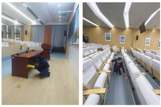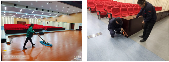 接到保障任务后,物业服务中心联合外包企业启动专项筹备。设施方面,对主分会场桌椅、空调、照明等开展拉网式排查,及时联动修复松动桌椅、照明故障等问题;环境方面,按"全域洁净"标准深度清洁培训区域,细化地面清扫、卫生间消杀等流程,并修剪会场周边绿化,以整洁校园风貌迎候培训。