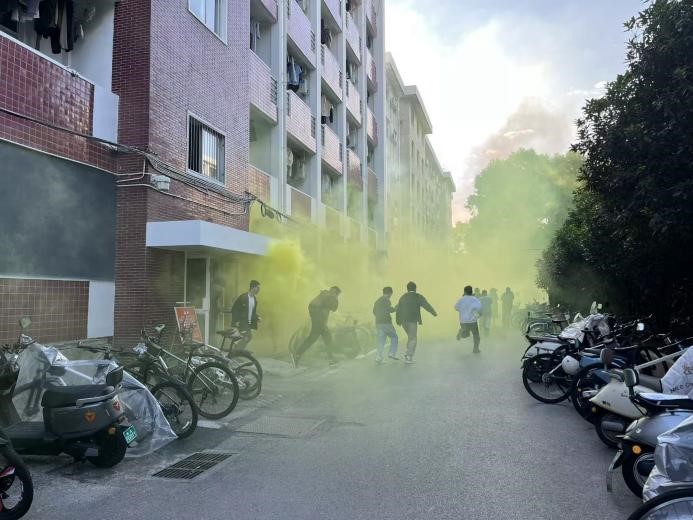 为确保演练科学有序开展,各单位结合二号南楼的建筑结构特点、人员分布情况及安全出口设置等实际因素,制定了具有针对性的演练方案。演练现场,哨声响起后,同学们迅速进入应急状态,用湿毛巾捂住口鼻、低头弯腰,按照预先规划的路线快速、有序地撤离至指定集合地点。