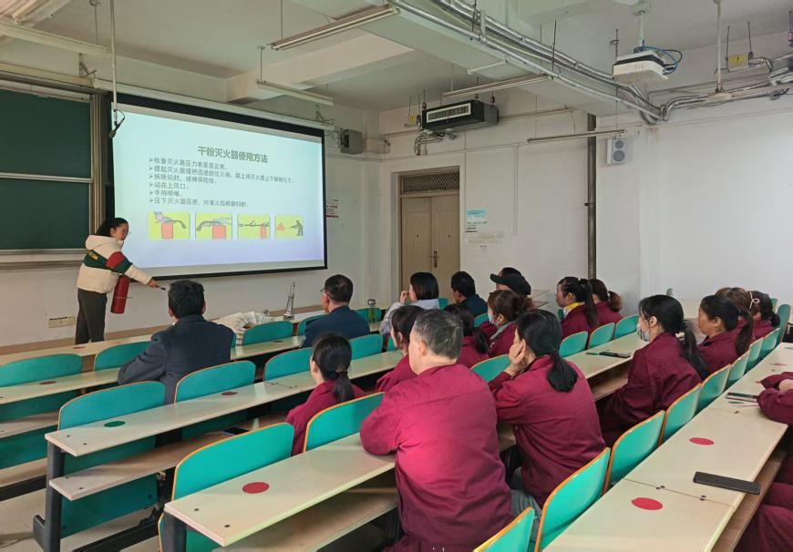 为进一步加强校园消防安全工作、提升后勤工作人员的消防安全意识、全面提高校园抵御火灾的能力,11月19日,翡翠湖校区物业服务中心在教学楼组织全体工作人员开展消防安全培训课程。