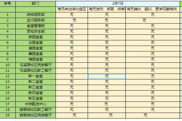 自疫情发生以来,饮食服务中心全面实行“日报告”制度,对552名各类员工健康与行踪进行全面动态摸排、统计、上报,进行“一对一”跟进,做到“零遗漏”。